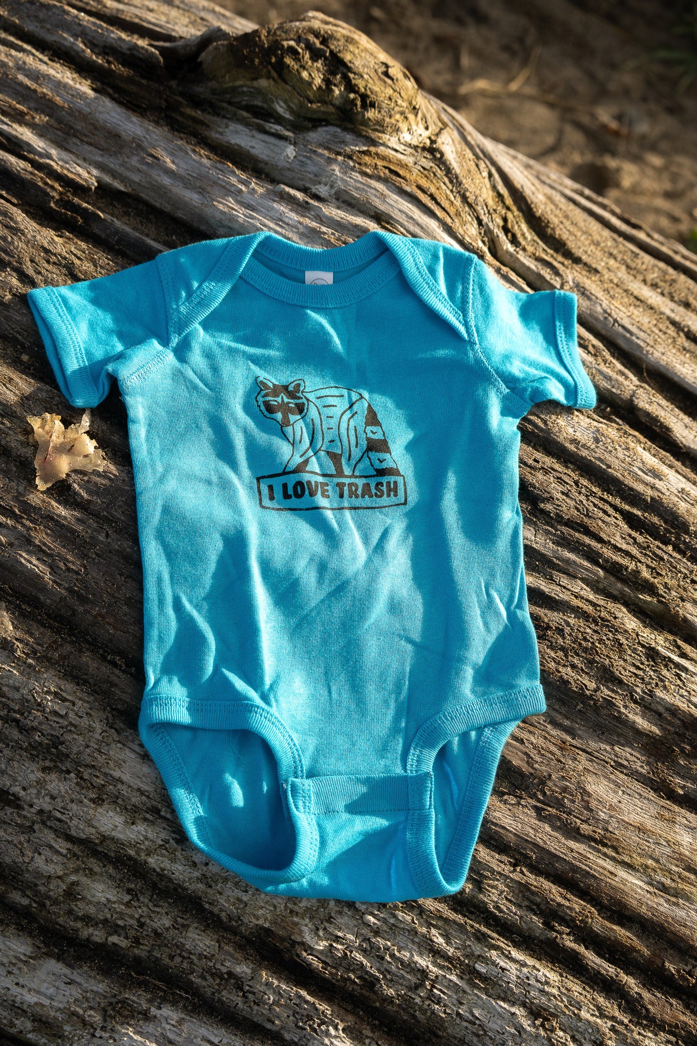 Printed on a 100% Cotton Rabbit Skins Onsie in aquatic Blue.