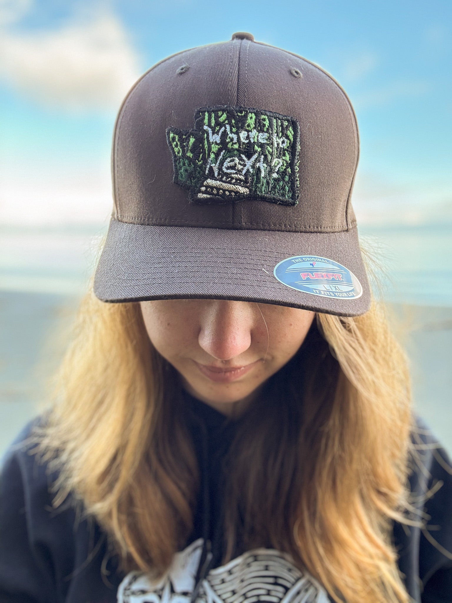 Where to Next? This one's for the travel lovers. An original art embroidered patch. On a Flex Fit structured cap.